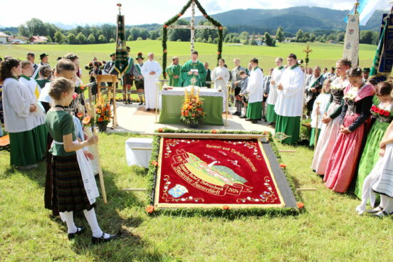 Ausgerechnet am „Tag der Tracht“ wurde im Oberlandler Gauverband eine neue Vereinsfahne geweiht. 7 Jahre nach der Zusammenlegung der beiden  Vereine „Schmied von Kochel“ Waakirchen und „Bodenscheid“ Hauserdörfl ist mit diesem feierlichen Akt der gemeinsame Verein Wirklichkeit geworden. Pfarrer Stephan Fischbacher zelebrierte neben dem Vereinsheim vor imposanter Kulisse der Tegernseer Vorberge einen einzigartigen Festgottesdienst.  In seiner Predigt ging er mit Blick auf Maibaum und das Trachtenheim auf den Gemeinschaftssinn und die Geselligkeit ein. Beides ist bedeutsam für unser Leben, ebenso die dritte Dimension, der Glauben. „Heute haben sich hinter der Fahne die Menschen versammelt, die sich für den Erhalt dieser Gemeinschaft, die Freude und die gemeinsame Schaffenskraft einsetzten“.