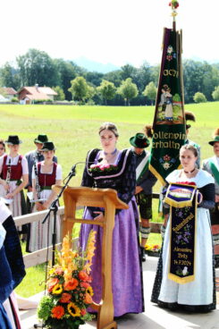 Nach der Bitte des 1. Vorstand Schorsch Noha an  Hochwürden Fischbacher die Fahne zu weihen, spendete dieser der neuen Fahne sowie den zahlreichen Fahnenbändern den kirchlichen Segen. Fahnenbraut Alexandra Britz stellte den Anwesenden in einem ausführlichen Prolog den Werdegang und die beiden Seiten der Fahne vor, übergab diese an Fähnrich Toni Rinner und befestigte das Band der Fahnenbraut. Ihr folgte die Fahnenmutter Gerti Rinner mit dem Wunsch dass die Gottesmutter Maria stets der Begleiter der Fahne sei. Als Pate fungierte der Nachbar – GTEV Schaftlach – Piesenkam, von ihnen wurde als Zeichen der Verbundenheit ebenfalls ein Band an die neue Fahne geheftet. Ein Dankesband folgte von Waakirchen an die Schaftlacher Fahne. Nicht fehlen durfte das Band der gut 30 Festjungfrauen des Vereins, die alle wunderschön im seidenen Miederg´wand anwesend waren. Angehängt wurde es von Martina Schmid. Vorplattler Max Hagleitner hatte auch ein Band der Plattlerburschen des Verein parat und befestigte dies am Fahnenkranz. Ein besonderes Band heftete Sofie Noha an, das der „Rosner-Stiftung, die uns schon jahrzehntelang gönnerhaft unterstützt und einen großen Teil der Kosten der Fahne übernahm. Zu guter Letzt wurde für die verstorbenen Mitglieder noch das Trauerband, gestiftet von der Gemeinde Waakirchen,  durch Barbara Rixner befestigt.