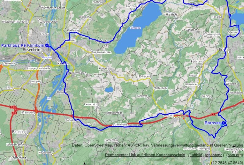 Diese rund 64 km lange Radtour führt von Rosenheim aus zunächst zum Simssee, wobei wir uns nicht auf dem bekannten Radweg zum Simssee befinden: Lediglich am nördlichen Ende des Sees befinden wir uns kurz auf der bekannten Radroute. Trotzdem fahren wir immer auf für Radfahrer zugelassenen Asphalt-, Wald- und Wiesenwegen, keine Trails. Allerdings sind die Abzweigungen teilweise verschlungen, unbekannt und oft nicht markiert, sodass eine detaillierte Beschreibung an dieser Stelle zu umständlich und komplex wäre. Aus diesem Grund empfiehlt es sich, diese Runde anhand des unten erwähnten GPX-Tracks oder einer guten Fahrradkarte nachzufahren.