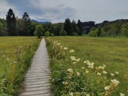Noch vor dem See befinden wir uns bei Spöck auf dem höchsten Punkt unserer Radtour mit einem prächtigen Panoramablick auf den Chiemsee. Das Kleinod Bärnsee wurde 2014 vom Bund Naturschutz aufgekauft, um diese wertvolle Moorlandschaft langfristig zu erhalten. Auch der Biber ist hier wieder beheimatet. Die Uferbereiche des Sees dürfen allerdings nicht betreten werden (Vorsicht: Kreuzottern). Über einen gut befestigten Bohlenweg durchqueren wir das artenreiche Moor (“Aschauer Fuizn”) und befinden uns bald beim Natur-Moor-Freischwimmbad Aschau. Hier können wir das schöne Wasserrad bewundern, kneippen, uns im Bad erfrischen und am Kiosk verpflegen. Nun geht es weiter entlang der Prien, danach auf einem schönen Höhenweg hoch über der A8 über Frasdorf und Achenmühle nach Rohrdorf. Von dort fahren wir rasant über einen langen Downhill zum Inn und zurück nach Rosenheim.