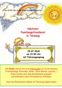 Am Sonntag, 29. Juli ist in Törwang auf dem Samerberg Dorfplatzfest ab 11 Uhr mit der Gebirgsschützenkompanie und mit dem Wintersportverein als Veranstalter. Vorher um 10 Uhr ist in der Pfarrkirche „Maria Himmelfahrt“ ein Familien-Gottesdienst mit Fahrzeugsegnung. Kinder dürfen mit ihren Fahrzeugen (Tretbulldogs, Fahrräder, Roller, Wave-Boards, Laufrad…) zur Kirche kommen. Diese Kinder-Fahrzeuge werden nach dem Gottesdienst gesegnet und sie bekommen einen Christopherus-Aufkleber. Auch die Erwachsenen können ihre Fahrzeuge segnen lassen.