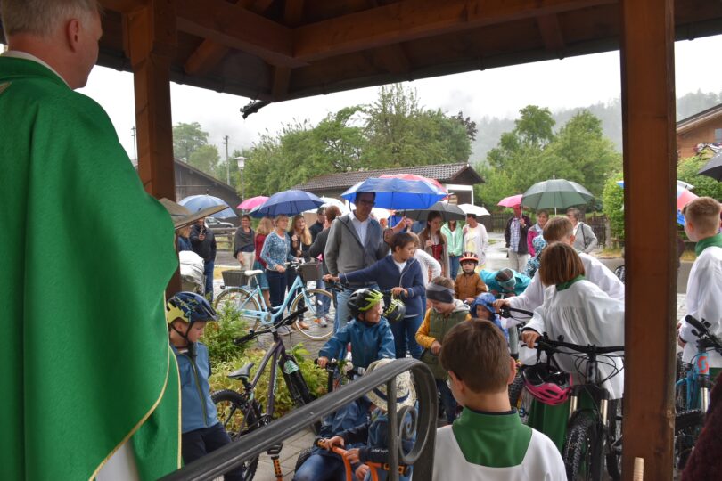 Von allen Seiten kamen die Kinder mit ihren kleinen Fahrzeugen zur Pfarrkirche. Geparkt wurde direkt vor der Kirchentür; denn drinnen fand ein Familien-Gottesdienst statt. Viele große und kleine Kinder mit ihren Eltern und Großeltern hatten sich eingefunden, um gemeinsam mit Pfarrer Martin Straßer die Messe zu feiern.
