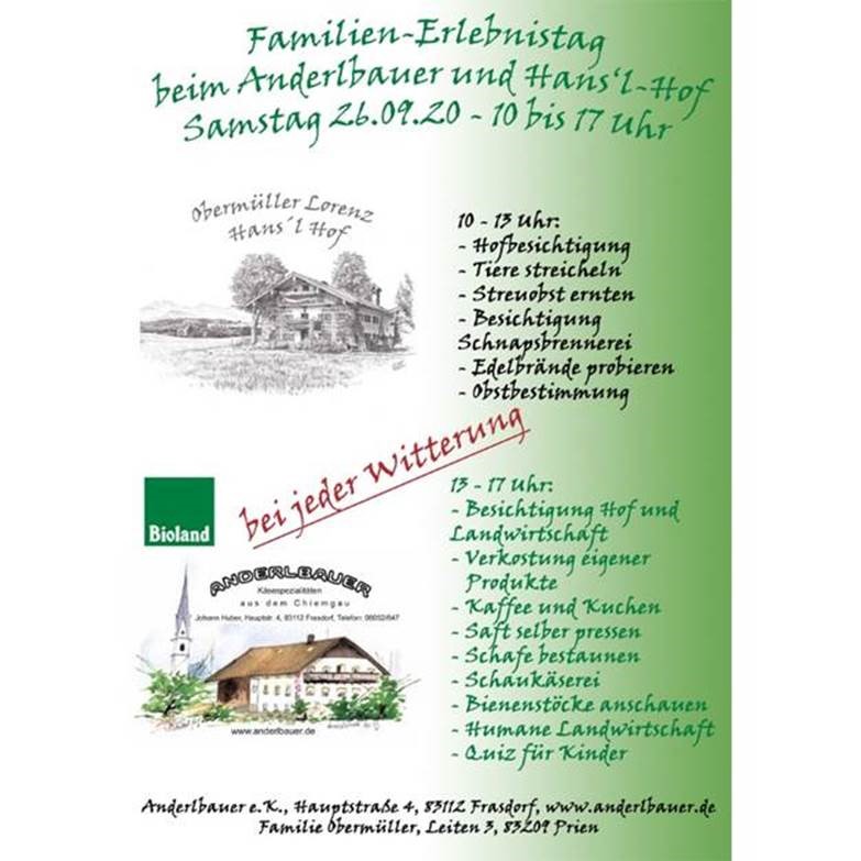 Am Samstag, 26. September ist beim Anderlbeuer in Frasdorf und beim Hanslhof in Prien-Leiten ein Familien-Erlebnistag. Beginn ist von 10 Uhr bis 13 Uhr beim Hanslhof mit Hofbesichtigung, Tiere streicheln, Streuobst ernten, Schnapsbrennerei-Besichtigung, Edelbrände-Probieren und Obstbestimmung. Anschließend – von 13 Uhr bis 17 Uhr werden beim Anderlbauer geboten: Besichtigung von Hof und Landwirtschaft, Verkostung eigener Produkte, Kaffee und Kuchen, eigenen Saft pressen, Schafe bestaunen, Schaukäserei, Bienenstöcke anschauen, Informationen zur humanen Landwirtschaft sowie ein Kinder-Quiz. Die Aktionen sind bei jeder Witterung.