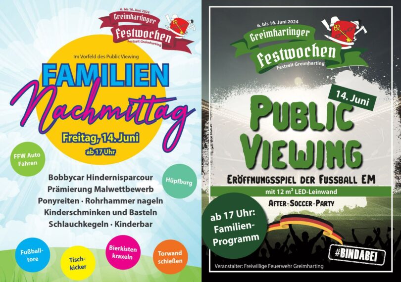Am kommenden Freitag, 14. Juni, findet im Rahmen der Greimhartinger Festwochen ein Familiennachmittag statt. Ab 17 Uhr können sich Familien auf ein buntes Programm freuen, das unter anderem folgende Aktivitäten bietet: Bobbycar-Hindernisparcours, Prämierung eines Malwettbewerbs, Ponyreiten, Rohrhammer-Nageln, Kinderschminken und Basteln, Schlauchkegeln, Kinderbar, Hüpfburg, Fußballtore, Tischkicker, Bierkistenkraxeln und Torwandschießen. Auch das Fahren mit einem Feuerwehr-Auto steht auf dem Programm.