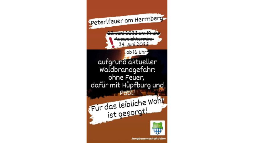 Aufgrund der aktuellen Waldbrandgefahr und dem ausgesprochenen Daxenfeuerverbot, muss sich die Jungbauernschaft Prien schweren Herzens gegen ihr geplantes Peterlfeuer am kommenden Freitag entscheiden. Als Ersatz dafür findet diesen Samstag, 24. Juni, am Herrnberg in Prien am Chiemsee ein Familienfest mit Hüpfburg und beheiztem Pool statt. Beginn ist ab 16 Uhr, für das leibliche Wohl ist gesorgt.