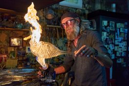 Als Glasbläser steht Sigi Franz ganz in der Tradition der Magier und Alchemisten. So versteht er es auch schnell bei seinen Glaskunstvorführungen die Augen der Kinder zum Staunen und Leuchten zu bringen. Nach der Vorführung geht es in die Ausstellung zum Magier Merlin aus Glas, zu detailgetreuen, übergroßen Insekten und zu schwebenden Herzen.