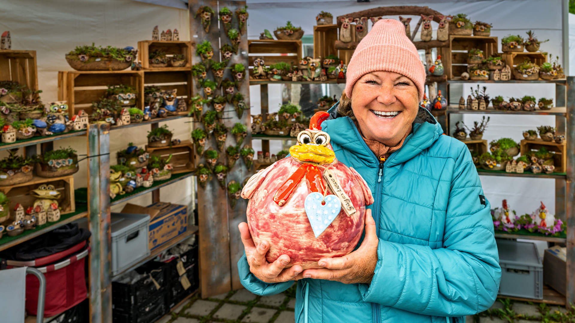 Ein eFarbenfroh, vielfältig und voller Leben: Frühlingsmarkt am Samerberg begeistert Besucherchtes Hühnerleben: Witzige Keramikfiguren mit sprechenden Namen sorgten für viele Lacher.