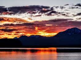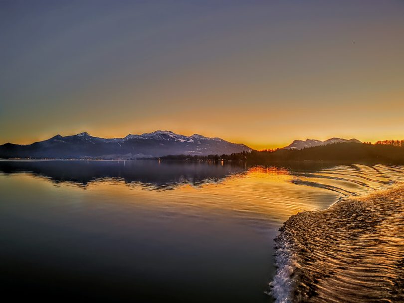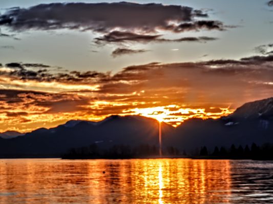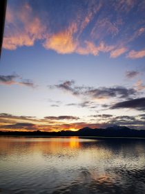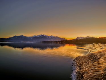 Der milde Winter sorgt zwar für weniger Schnee und Weiß, dafür aber für mehr Farben – besonders beim Sonnenaufgang am Morgen und ganz besonders auf dem Chiemsee – wie diese aktuellen Aufnahmen zeigen.