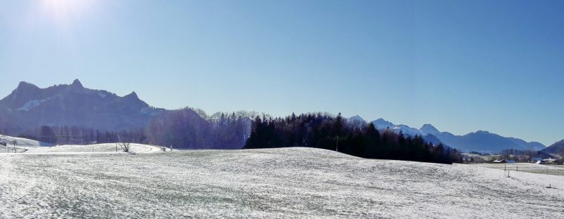 Nicht tiefer Winter sondern eher frühlingshafte Bilder sind derzeit auf dem Samerberg vorzufinden. Blauer Himmel, weiß-blaue Berge und grün-weiße Felder bestimmen derzeit das Landschaftsbild vom Hochtal bis zur Hochries – wie diese aktuellen Aufnahmen zeigen.