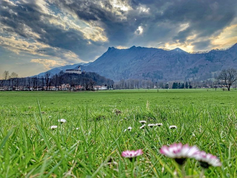 Ob in der Natur oder im Leben, Schatten und Licht, sind sehr oft ganz nah zusammen. Besonders im Frühjahr und in der derzeit prägenden Zeit, gibt es sehr oft faszinierende Momente zum Bestaunen. Im satten Grün stehen die Wiesen inzwischen im Saft und zwischendrin räkeln sich die ersten Blüten aus der Erde empor. Während am Horziont Sonne und Wolken sich um die Wette präsentieren, lässt sich das mächtig trohnende Schloss Hohenaschau durch nichts verbiegen. Auf sich zu schauen und zu besinnen, ist gerade jetzt wichtiger denn je, denn wie die Luft zum Atmen so braucht der Mensch auch Licht, um sich wohlfühlen zu können.