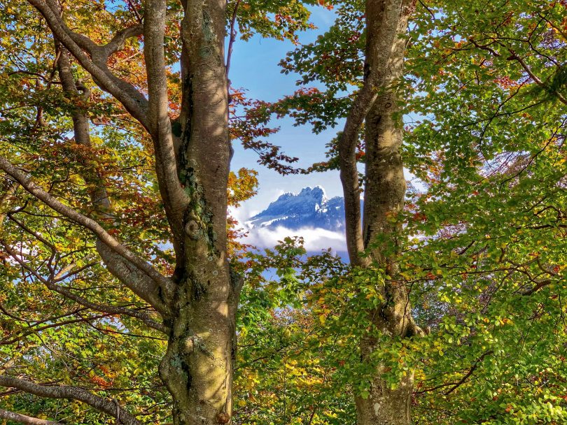 Nebelschwaden ziehen auf und feuchte Luft umgarnt einen, ja es ist Herbst. Aber nichts desto trotz sollte man sich aufmachen und die Ruhe und anschmiegsame Stimmung in der Natur genießen. Doch plötzlich öffnen sich die Nebelschwaden im Hofalmgebiet bei Aschau und lassen durch den bunten Herbstwald einen einzigartigen Blickwinkel auf den dreizackigen Gipfelgrat der Kampenwand schenken. Was für eine Anmut zeigt sich dabei, das derzeitige Farbenspiel in der Natur ist einfach herrlich anzuschauen und beschert besondere Augenblicke zum Staunen und Genießen.
