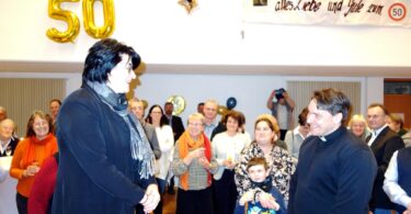 „Heute haben wir einen Tag der Freude und der Gemeinschaft und viele von uns haben sich maskiert und sind in eine andere Rolle geschlüpft. Bedenken wir dabei, dass wir als Christen keine Rolle spielen, sondern dass Christsein eine Lebenseinstellung ist“ – so Pfarrer Sebastian Heindl. Den frohmachenden Gottesdienst beendeten die Kindergartenkinder von Waging, die eigens für das Jubiläum und für die Faschingsmusik ein Lied einstudiert haben. Alsdann ging es zu einem Standkonzert und mit einem Festzug zum Festzelt zum Festausklang.