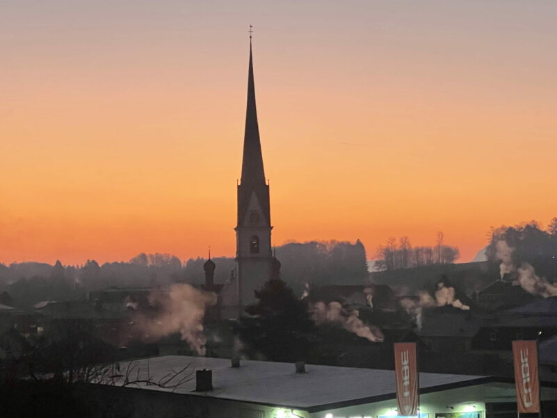 Unsere Bilder zeigen den Tagesbeginn in rot mit Blich auf die Marktgemeinde Prien mit der Pfarrkirche “Mariä Himmelfahrt” – gesehen vom Priener Ortsteil Bruck.