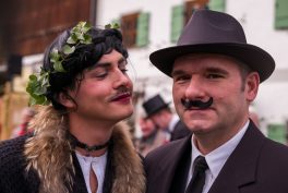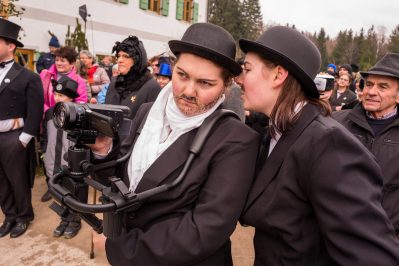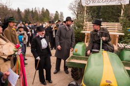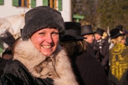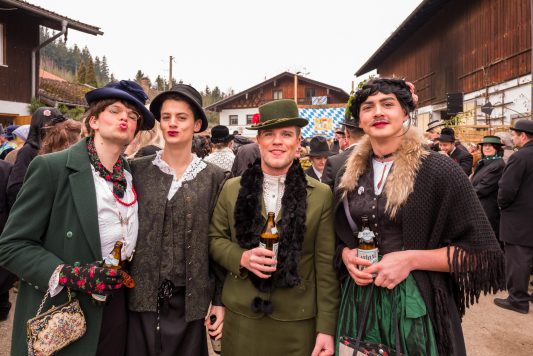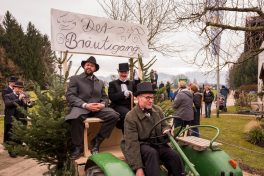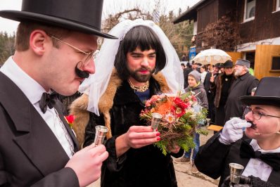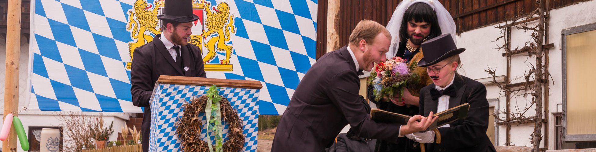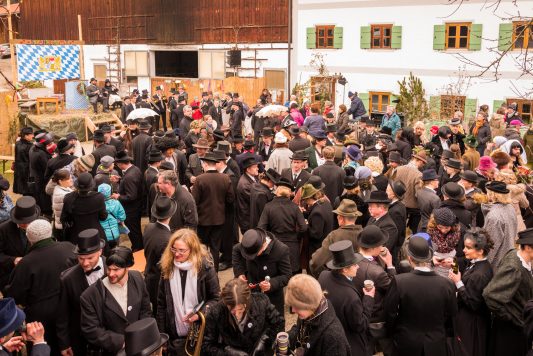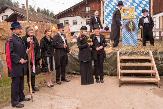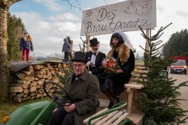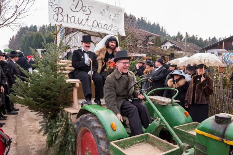 Ein besonderes gesellschaftliches Ereignis fand heute beim Gaishacker-Bauern in Prien-Gaishacken statt. Dort feierte man erstmals seit 20 Jahren wieder eine Faschingshochzeit, mit allem was dazugehört. Das Brautpaar „Vollbärta Schwenglstengl aus Rögerlingen“ und „Blasius Brieglbeisser aus Huberting“ gaben sich heute vor einer großen Hochzeitsgesellschaft das Ja-Wort. Der Hochzeitslader hatte viel zu tun, um das Brautpaar in Zaum zu halten, denn der Bräutigam versuchte noch kurz vor der Trauung durch Flucht dem Stand der Ehe zu entgehen. Nachdem man ihn einfing, brauchte es viel Kampf, Bräutigam und Braut zu überreden, sich das Ja-Wort zu geben. Doch jetzt sind sie ein Paar, wenn auch optisch grundverschieden, so führte sie doch die Liebe zusammen – zumindest bis zum Aschermittwoch.