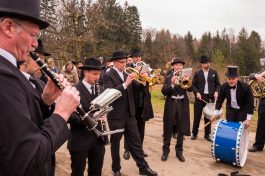 Begleitet wurde die Verehelichung unter freiem Himmel von der Blaskapelle Wildenwart. Sie gab musikalisch ihr bestes, die Zeremonie würdig zu gestalten. Der mit großer Mannschaft angerückten Feuerwehr Atzing war es zu verdanken, dass trotz großen Menschenauflaufes und vieler Zaungäste die Zeremonie auf dem Misthaufen nicht außer Kontrolle geriet und Tumulte weitestgehend vermieden wurden. Lustig und „guad aufglegt“ stellte sich die Gesellschaft schließlich zum Hochzeitszug auf, der durch ein Spalier vieler Zaungäste unter vorbildlichen Geleitschutz durch die Feuerwehr Atzing, gemütlich bis zum Vereinshaus in Atzing führte. Dort versammelte man sich zunächst zu einem Gruppenbild, um anschließend in den festlich geschmückten Saal des Vereinshauses einzuziehen, wo man bis weit in die Nacht feierte und tanzte. Einzelheiten der Feier mussten leider aus Gründen des Jugendschutzes „zensiert“ werden…So kann über das Hochzeitsmahl, und dem schmatzenden, ausgedehnten Begrüßungsritual durch das Brautpaar im „hochherrschaftlichen“ Vereinshaus vielleicht erst später nach Zensur berichtet werden…Nur so viel sei angedeutet, die Festredner gaben dem Brautpaar in ihren Ansprachen noch viele völlig unbrauchbare, lebens- und ehefeindliche Ratschläge mit, so dass viele Tränen nicht nur aus Rührung flossen…