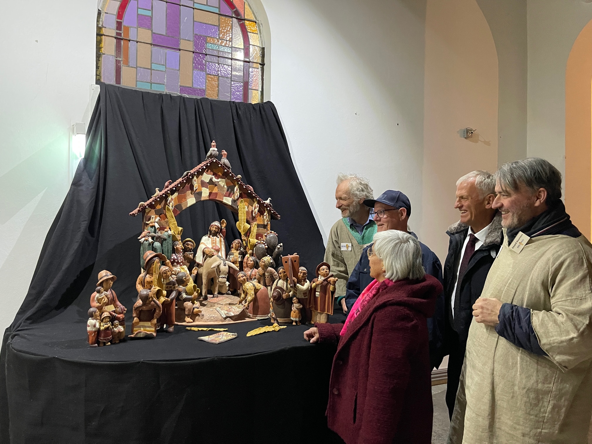 Vor der Krippe “Jesu Einzug in Jerusalem – Palmsonntag”: v.l.n.r.: Pfr. Heinrich Wagner (Obmann) , Sammler Richard Sedlacek, Leihgeberin Rina Gurten, Eröffner Dekan Peter Bertram, Dir. Eduard Baumann Foto: Bibelwelt / Anna Farnoosh