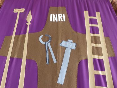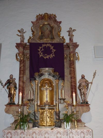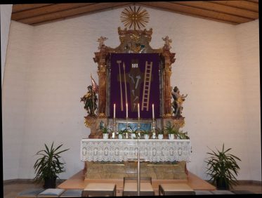 Auf dem mittleren Tuch am Hochaltar sind die Leidenswerkzeuge (auch Passionswerkzeuge, lateinisch Arma Christi, „Waffen Christi“) zu finden. In Brauntönen gehalten erinnern das Kreuz mit dem Titulus crucis (INRI), die zur Kreuzabnahme verwendeten Leitern, Kreuznägel mit Hammer, Zange zur Entfernung der Kreuznägel und die Lanze, mit der ein römischer Soldat Jesus die Seitenwunde zufügte, an das Geschehen am Karfreitag. Sie stehen in direkter Beziehung zum Leiden und Sterben Jesu Christi, ebenso wie die Dornenkrone und das Grabtuch, die auf den beiden Seitenaltären dargestellt sind.