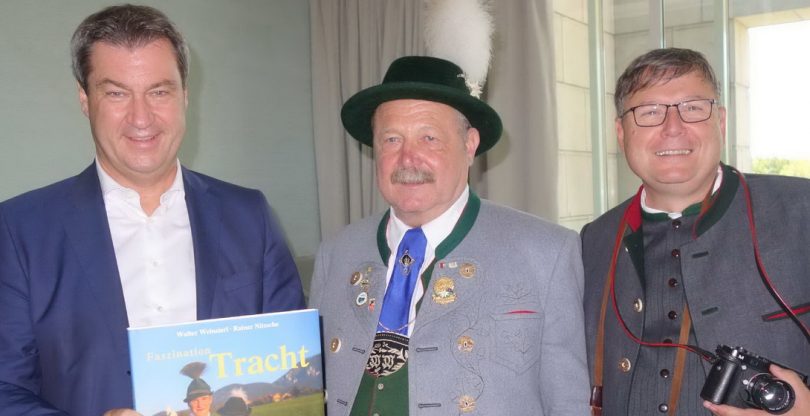 Trachten spielen in Bayern eine bedeutende Rolle und erfreuen sich auch von höchster Stelle großer Beliebtheit. Dies bestätigte sich dieser Tage in der Bayerischen Staatskanzlei als im Ministerratssaal das vom Rosenheimer Verlagshaus herausgegebene Buch „Faszination Tracht“ vorgestellt und im Beisein von Landesvorsitzenden Max Bertl an Ministerpräsident Dr. Markus Söder überreicht werden konnte. Dabei erläuterte Walter Weinzierl, Ehrenkassier des Bayerischen Trachtenverbandes und Ehrenvorstand des Bayerischen Inngau-Trachtenverbandes als Autor den Inhalt des Buches. Dieses entstand mit Fotografien von Rainer Nitzsche vom Samerberg und zeigt in erster Linie Aufnahmen von den drei vorjährigen Gautrachtenfesten des „Trachtensommers im Chiemsee-Alpenland“ in Prien-Atzing, Bad Feilnbach und Neubeuern. Die aus rund 3.000 gemachten und letztlich für das Buch ausgewählten Aufnahmen zeigen lebendige Szenen von trachtlerischen Auftritten und Umzügen ebenso wie Detailaufnahmen zu den Bestandteilen einer Tracht. Bei der Übergabe des Buchs bedankte sich Ministerpräsident Dr. Markus Söder mit den Worten: „Was wäre Bayern ohne die Trachten?“ und er gab selbst darauf folgende Antwort: „Beileibe nicht eines der schönsten Länder auf dieser Welt“.