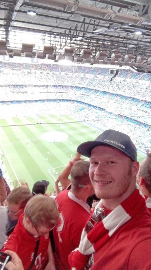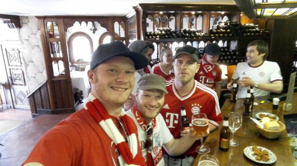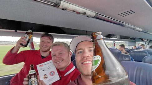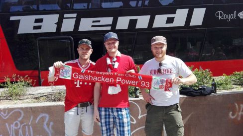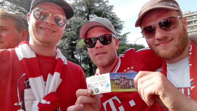 Vom Ausgang des Champion-Liga-Viertelfinal-Spiels Real Madrid gegen FC Bayern München leidgeprüft und wohl auch nach 24 Stunden Bus-Hinfahrt reisegeplagt hat ein Trio des Fanclubs vom FC Bayern München aus Prien-Gaishacken die Heimreise angetreten. „Das Spiel und das Stadion waren ein echtes Erlebnis, nur mit dem Schiedsrichter und letztlich mit dem Ausscheiden haben wir hadern müssen“, so Matthias und Martin Stoib, die zusammen mit Florian Hamberger die weite Reise am Ostermontag angetreten hatten. Als Zweiter Vorplattler des Trachtenvereins „Daxenwinkler“ Atzing hatte er natürlich Einladungskärtchen mit dem Programm für das heurige Chiemgauer Gautrachtenfest in Atzing dabei. Bei all den Strapazen und spannenden Eindrücken: die gute Laune konnten diese dem Trio nicht nehmen.