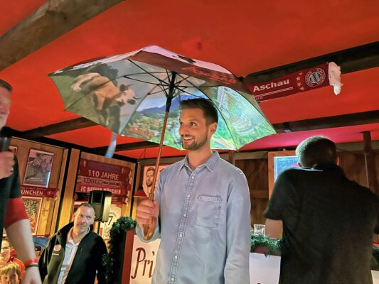 Die Vereinsführung des Fanclubs, vertreten durch den 1. Vorstand Toni Huber und den 2. Vorstand Peter Feistl, nutzte die Gelegenheit, um Seven Ulreich zu ehren. Mit einer feierlichen Urkunde wurde dem Torhüter die Ehrenmitgliedschaft im Fanclub Priental Bayern Aschau verliehen, als Ausdruck der tiefen Verbundenheit zwischen dem Spieler und seinen begeisterten Anhängern. Als besondere Präsente erhielt der FCB-Star einen exklusiven Aschau Regenschirm sowie einen praktischen Aschau Rucksack als Erinnerung an diesen denkwürdigen Tag. Diese Geschenke symbolisieren nicht nur die nützlichen Begleiter im Alltag, sondern auch die enge Verbindung und Wertschätzung zwischen Sven Ulreich und dem Fanclub.