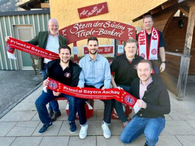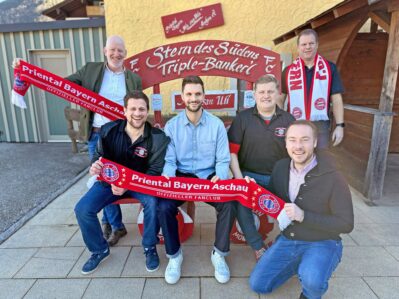In der Lolabar mitten in Aschau war kein Platz mehr zu bekommen, Sven Ulreich, seit 2015 Torhüter beim FC Bayern, war angekündigt und alle, alle wollten ihn sehen. Rund um den Ratskeller sind bereits am frühen Morgen sämtliche Parkplätze voll, alle wollten noch einen Platz beim „FC Bayern Fanclub Priental Bayern“ im Fankeller haben. Bereits vor ein paar Wochen hatte der FC Bayern seine Spieler „aufs Land“ geschickt, wegen der Schneefälle an diesem Wochenende mussten jedoch alle Besuche abgesagt werden. Egal – beim zweiten Mal ist es noch schöner und Fanclub, Vorstandschaft und Fans freuten sich auf den Sonntagvormittag und den angekündigten Besuch des Bayerntorhüters aus München. Nicht nur die 159 Mitglieder des Vereins waren gekommen, sondern darüber hinaus so viele, wie in den Keller hineinpassten. Endlich kam auch Sven Ulreich und fand ohne große Suche direkt zum Ratskeller und zur Lolabar. Direkt vor dem Eingang steht im Bankerldorf Aschau natürlich eine Bank, in diesem Fall das „Stern des Südens-Triple-Bankerl“ und so begann der Besuch gleich mit einem Probesitzen auf der Bank und dem obligatorischen Fototermin. Tosender Applaus empfing ihn dann in der übervollen Lolabar, das lange Warten auf den beliebten Torhüter hatte ein Ende und die Vorstandschaft des Fanclubs freute sich, dass es nach dem Besuch von Xabi Alonso im Jahr 2015 bereits zum zweiten Mal gelang einen der Bayern-Meisterspieler nach Aschau zu bekommen. Der Vorsitzende Toni Huber und sein Stellvertreter Peter Feistl stellten dem Plenum kurz den Fanclub Priental und den Gast Sven Ulreich vor und dann zeigten ihm der zweite Bürgermeister Michael Andrelang und Tourismuschef Herbert Reiter einiges von den Schönheiten im Oberen Priental.