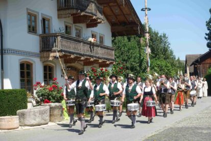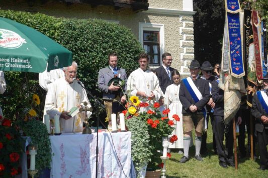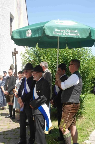 Angesichts der hochsommerlichen Temperaturen schon früh am Morgen waren Schattenplätze und Schirme bei den Feierlichkeiten heiß begehrt. Unter den Gästen waren neben Mitgliedern von Patenvereinen, Bruderverein und vielen befreundeten Vereinen auch viele Rosenheimer Stadträte. Der Gottesdienst beim Bichler-Hof in Fürstätt wurde zelebriert von Pfarrer Sebastian Heindl. Er segnete dann auch das Ehrenband. Deren Patin ist Maria Bichler, deren Vorfahre ein Gründungsmitglied der Veteranen- und Reservisten-Kameradschaft Fürstätt war.