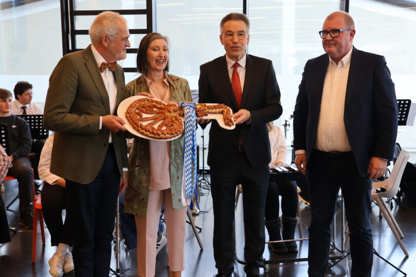 Schulleiterin Claudia Romer, ihr Vorgänger Gerhard Heindl (links) und Landrat Otto Lederer (2.v.re.) nahmen den symbolischen Schlüssel von Peter Schwinde vom Architekturbüro Schwinde (rechts) entgegen. Foto: Landratsamt Rosenheim.