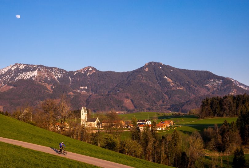 Die Aussichten werden wieder farbiger auf dem Hochtal des Samerbergs, wenn sich auf den nahen Bergen der Schnee im Frühling zurückzieht und die weißen Flächen immer kleiner und weniger werden. Damit machen sich auch die Wanderer, Radler und Mountain-Biker wieder vermehrt auf den Weg – so wie auf unserem aktuellen Feierabend-Stimmungsbild vom Samerberger Ortsteil Rossholzen. Die Radtouren-Aufnahme gewährt einen Blick auf die Kirche St. Bartholomäus in Rossholzen sowie auf Hochries, Karkopf und Feichteck.