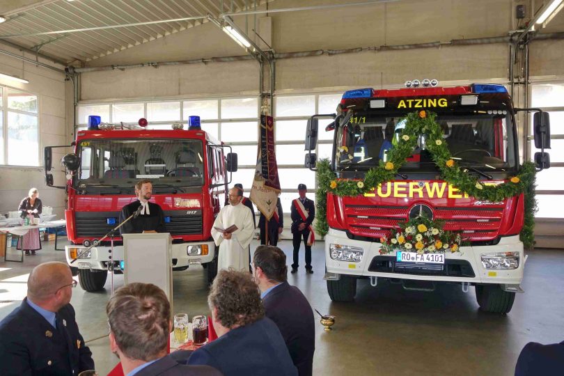 Freudiger Tag für die Freiwillige Feuerwehr in Prien-Atzing: mit einem ökumenischen Segen und mit einer geselligen Feier wurde das neue Fahrzeug LF 20 Kat S den eigenen Feuerwehrleuten sowie Feuerwehrkameraden aus der Nachbarschaft vorgestellt. Das 430.000 Euro teure, 300 PS starke und zeitgemäß ausgerüstete Fahrzeug löst das Vorgänger-Fahrzeug LF 8/6 ab, das von 1997 bis zuletzt guten Dienst leistete.