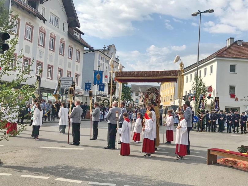 „Heute stehen nicht Autos im Mittelpunkt des wunderschönen Marktplatzes von Prien, sondern die bleibende Gegenwart Gottes“ – mit diesen Worten hieß Pfarrvikar Gottfried Grengel die Teilnehmer am Festgottesdienst mit anschließender Prozession durch den Ort am Morgen des Fronleichnamstages in der Priener Ortsmitte willkommen. Zugleich dankte er allen, die mit ihren Ortsvereins-Fahnen sowie mit den Prozessions-Stangen und Prozessions-Figuren (getragen von Dirndln der Trachtenvereine Atzing, Greimharting und Prien) eine wahrlich tragende Rolle übernommen haben. Sein weiterer Dank galt dem großen liturgischen Dienst und allen Leuten, die mitgeholfen haben, die Altäre am Marktplatz, vor dem Rathaus und im Ortsteil Gries herzurichten sowie jenen Hausbesitzern, die ihre Fenster mit den roten Fronleichnamstüchern schmückten. Für die musikalische Gestaltung sorgten der Priener Kirchenchor unter der Leitung von Bartholomäus Prankl sowie die Priener Blaskapelle mit ihrer Dirigentin Regina Huber. Feierlich mit dem Himmel und dem Allerheiligsten, mit den Bürgermeistern, Gemeinderäten und den Indischen Schwestern sowie mit den Abordnungen der Priener Ortsvereine zogen die Gläubigen durch Prien und wieder zurück zum Marktplatz. Ein Gast, der auf den Rollator angewiesen war und nicht mitmarschieren konnte, drückte seine Freude mit folgenden Worten aus: „Dieser Platz in Prien, die feierliche Gestaltung des Gottesdienstes und die farbenfrohe Brauchtumspflege geben einem Freude und Kraft, Danke an alle Priener“. Schon bald werden die Priener wieder guten Grund zum festlichen Feiern haben, wenn ab Donnerstag, 23. Juni (bis Montag, 27. Juni) im Festzelt am Hohertinger Weg das Jubiläum „125 Jahre Markterhebung“ gefeiert wird. Dann wird am Sonntag, 26. Juni ein ökumenischer Fest-Gottesdienst in Trautersdorf um 10 Uhr zu den Höhepunkten des Jubiläums gehören.