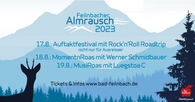 - Almrausch 17.8.2023: Auftakt mit Rock’n’Roll Roadtrip, Musikpavillon Bad Feilnbach, 17 Uhr