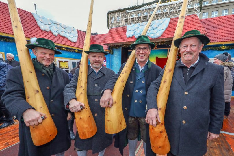 In diesem Jahr statteten die Feldwieser Alphornbläser mit vier Mann der Weihnachtsstadt, einem der größten und schönsten Weihnachtsmärkte Deutschlands, einen Besuch ab. Sie begeisterten dabei mit Auftritten unter anderem am Stand des Tourismusvereins Übersee-Feldwies e.V., dem „Chiemseer Stamperltreff“, auf der Bühne am Alten Markt und im Weihnachtsdorf. Im letztgenannten entstanden auch die Bilder der Feldwieser Alphornbläser und von Schorsch Schobersteiner und Artur Schultz vom Tourismusverein Übersee-Feldwies e.V. bei der Scheckübergabe mit einer Spende für den Verein des Weihnachtsdorfes an den 1. Vorsitzenden Patrick Arens und an Frau Ulla Schilling, Organisatorin des Weihnachtsdorfes.