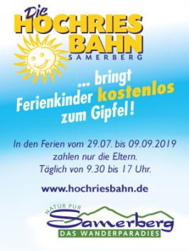 Auch dieses Jahr bietet die Hochriesbahn ein besonderes Ferienschmankerl für Familien mit Kindern an. Während den diesjährigen Sommerferien vom 29. Juli 2017 bis 9. September 2019 dürfen Kinder und Jugendliche bis 16 Jahre in Begleitung zahlender Erwachsener die Bergbahn kostenlos benutzen. Ausgenommen sind Biketransporte.