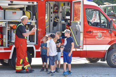 Zum Schluss kamen auch noch Schere und Spreizer zum Einsatz an zwei Unfallwagen. Die Kinder waren begeistert von den vielen Erklärungen und wollten wissen, wann sie auch bei der Freiwilligen Feuerwehr mitmachen können. Die Meisten müssen noch einige Jahre warten, denn in die Jugend-Feuerwehr geht es erst ab vierzehn Jahren. Markus Mauracher und Josef Loferer (1. und 2. Kommandant) wiesen darauf hin, dass jeder bei Interesse vorbeikommen kann und bei den Übungen zuschauen. Die Termine sind auf der Homepage unter www.Feuerwehr-Schleching.de zu finden. Nachwuchs wird bei der Freiwilligen Feuerwehr immer gebraucht. wun