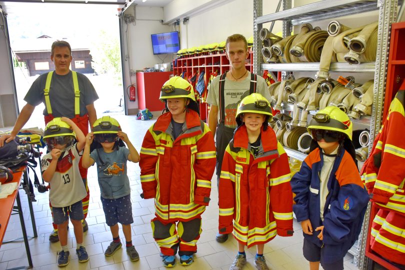 Die dicken Wasserschläuche der Feuerwehr hatten natürlich bei dem schönen Wetter magische Anziehungskraft. Es musste dabei auch Geschicklichkeit gezeigt werden und eine Reihe Pylonen mit dem Wasser getroffen oder bei einem aufgestellten Häuschen die Flammen umgeklappt werden. Während eine Gruppe mit Kindern mit dem Feuerwehrauto durchs Dorf gefahren wurde, erklärte Stefan Koller das umfangreiche Innenleben eines Löschfahrzeugs. Sehr interessiert waren die kleinen und größeren Gäste auch an der Kleidung bei einem Einsatz. Alles durfte anprobiert werden, die Jacken und Hosen waren natürlich viel zu groß, aber die Kinder konnten registrieren, wie schwer ein Helm oder ein Atemschutzgerät sind oder wie sich eine Fluchthaube anfühlt. Timo Kleinschroth und Matthias Gasteiger halfen beim Anprobieren und erklärten, was alles beachtet werden muss.