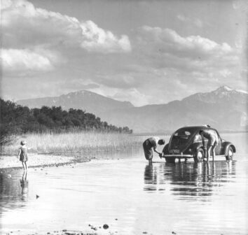 BHM_Fotoausstellung_Leben am Chiemsee 1.jpg: Die knappe Freizeit musste sinnvoll genutzt werden! Eine Autowäsche am Chiemseeufer ist heute undenkbar und war damals nicht unüblich. (Chiemsee, 1953) © Bayerische Staatsbibliothek, Fotoarchiv Nikolai Molodovsky.