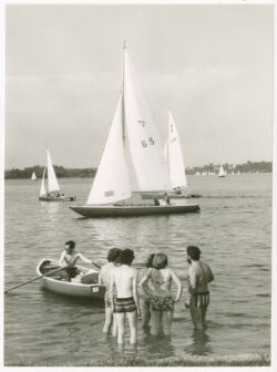 BHM_Fotoausstellung_Leben am Chiemsee 2.jpg: Auch das Rudern gehörte neben dem Segeln und dem Schwimmen zu den beliebten Aktivitäten in den Sommermonaten. (Chiemsee, 1972) © Bayerische Staatsbibliothek, Fotoarchiv Nikolai Molodovsky.