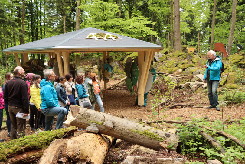 Umweltbildungsreferent Lukas Laux nahm die Interessierten mit hinauf in die Waldgärten. Dort ist auf kleiner Fläche ein Mini-Nationalpark entstanden. Zwischen den Bäumen haben sich markante tierische Bewohner versteckt – dargestellt von farbigen Holztafeln. Am Boden ist die Wildnis daheim – mit Totholz, Baumpilzen, Jung-Bäumchen und allerlei typischen Waldpflanzen. Und in der Mitte steht ein großer Holzpavillon mit leicht verständlich aufbereiteten Infotafeln über das größte zusammenhängende Waldschutzgebiet Mitteleuropas.