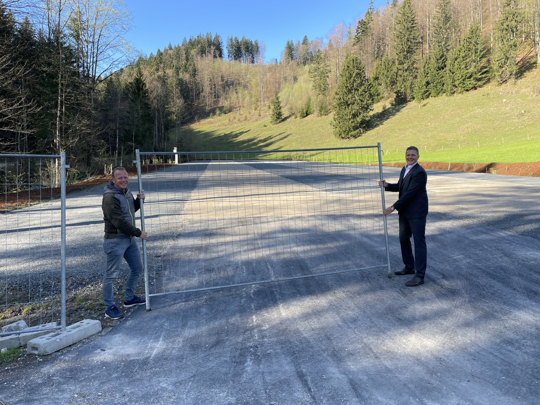 Der neue Parkplatz in Hintergschwendt / Gemeinde Aschau mit rund 150 Stellplätzen ist fertig. Eigenhändig entfernte Bürgermeister Simon Frank (rechts) zusammen mit dem Leiter des Bauamtes Martin Stuffer (links) den letzten Bauzaun und gab den Parkplatz damit frei für die Öffentlichkeit.