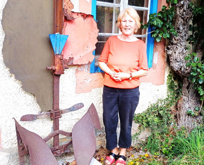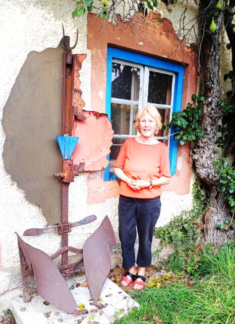 Bericht und Foto: Christiane Giesen – Pia Starzmann, die Witwe des 2023 verstorbenen Politikers und Künstlers Gustav Starzmann, neben seiner Skulptur „Bauernsterben“, die auf Veranlassung der Gemeinde Übersee nun im öffentlichen Raum in der Feldwies aufgestellt wurde.