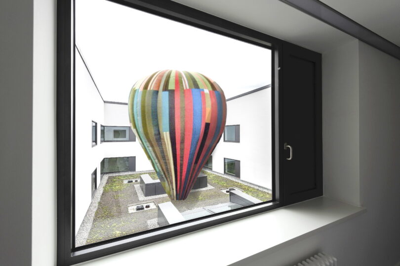 Der Ballon gehört als wesentliches Element zur Kunstinstallation „Up!“, Siegerentwurf des Wettbewerbs Kunst am Bau. Die Münchner Künstlerin Katharina Gaenssler konnte damit im Januar 2024 die hochkarätig besetzte Jury überzeugen. Mit einem Durchmesser von 4,60 Metern und einer Länge von sechs Metern wird er als heliumgefüllte Skulptur im Innenhof der Bavariathek, dem Medienzentrum des Hauses der Bayerischen Geschichte, verankert. Zu besonderen Gelegenheiten werden die Seile gelockert, der Ballon kann hochsteigen und bis zu 30 Metern über dem Erdboden schweben. Befestigt bleibt er dennoch – er steht und pendelt direkt über dem Bavariatheksgebäude. An Bord sind keine Menschen, sondern verschiedene Kameras. Katharina Gaenssler entwickelt aus deren Bildern eine Wandcollage, die schließlich auf eine große Wandfläche im Foyer der Bavariathek tapeziert wird.