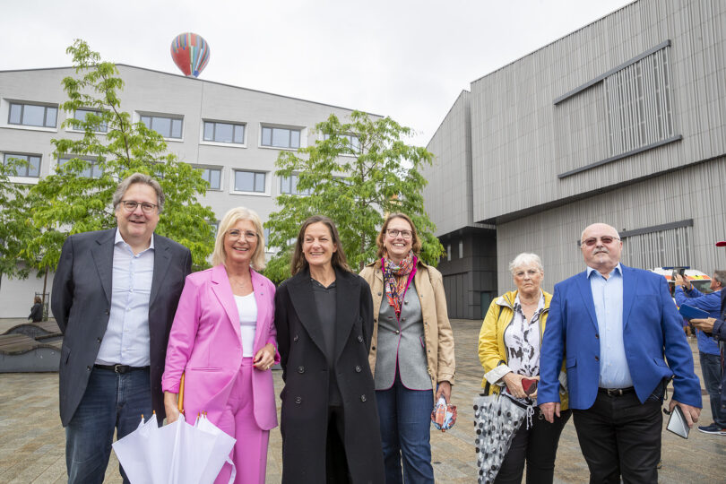 Das Haus der Bayerischen Geschichte in Regensburg ist seit Samstag in Besitz eines eigenen Musemsballons! Der Wettergott hatte ein Einsehen: pünktlich um 11.30 Uhr Regenpause – und der Ballon konnte im Beisein von Bayerns Sozial- und Jugendministerin Ulrike Scharf und Dr. Richard Loibl, Direktor des Hauses der Bayerischen Geschichte, seine Premierenfahrt aus dem Herzen des Gebäudes der Bavariathek heraus in den Regensburger Himmel aufnehmen. Der Ballon ist zentraler Bestandteil der Kunstinstallation „Up!“ der Münchner Künstlerin Katharina Gaenssler, die damit im Januar 2024 den Wettbewerb „Kunst am Bau“ gewonnen hat. Er ist im Innenhof der Bavariathek verankert und wird künftig zu besonderen Anlässen seine Fahrt aufnehmen und senkrecht in die Luft steigen, wie nun zum ersten Mal anlässlich des Fests der Demokratie. Im Laufe des Wochenendes konnte er immerhin acht Mal seinen Aufstieg vornehmen. An Bord sind Kameras, deren Bildmaterial von Gaenssler zu einer wandfüllenden Collage verarbeitet werden.