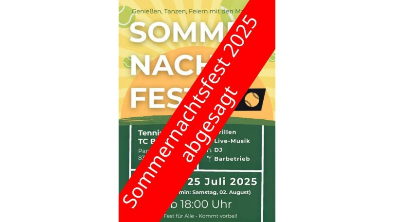 Aufgrund der anhaltend schlechten Wetterprognosen muss das für Samstag, 2. August, geplante Sommernachtsfest des Tennisclubs Bernau leider ersatzlos abgesagt werden.