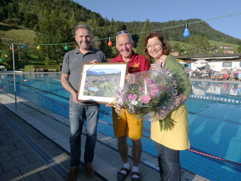Das Angebot in Cillis Kiosk sei ständig erweitert worden und es werde dort fast schon Restaurantqualität geboten. „Cilli und Walter, ihr und eure Familie habt wirklich Großes geleistet und für uns in Reit im Winkl und unsere Gäste aus nah und fern unser Freibad zu dem weiterentwickelt, was es heute ist: unser Juwel im Sommerbetrieb“, sagte Bürgermeister Matthias Schlechter. Er sprach ihnen dafür einen großen Dank aus und überreichte ihnen zur Erinnerung ein einmaliges Bild vom Freibad mit weiterem Blick auf Reit im Winkl bis hin zum Kaisergebirge. Zugleich zeigte er sich hocherfreut, dass Cilli Wolfenstetter mit ihrem Team den Kiosk weiterbetreibt und drückte seine Hoffnung aus, dass dies noch viele Jahre so bleibe.