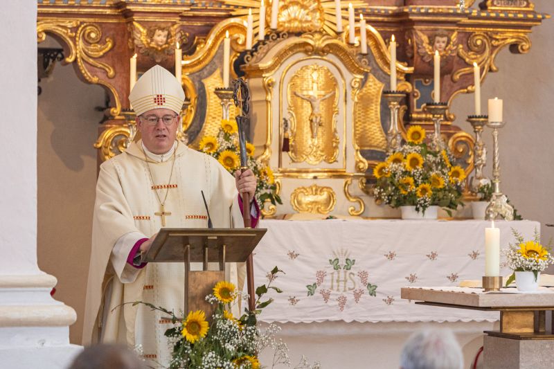Der Festgottesdienst wurde von Weihbischof Rupert Graf zu Stolberg zelebriert, der in seiner Predigt die Bedeutung des Glaubens für die heutige Zeit betonte. „Es ist unsere Aufgabe, den Glauben weiterzutragen und als Boten des Glaubens zu wirken“, sagte der Weihbischof. Besonders beeindruckt zeigte er sich von dem lichtdurchfluteten Raum der Kirche, den er als Zeichen für die Schönheit des Glaubens interpretierte. Gemeinsam mit dem Weihbischof zelebrierten Pfarrer Claus Kebinger, Pfarrer i.R. Herbert Zimmermann und Gemeindereferent Tobias Gaiser die Messe. Viele Ministranten sowie zahlreiche Vereinsfahnen gaben dem Gottesdienst eine besonders festliche Atmosphäre. Musikalisch wurde der Gottesdienst vom Kirchenchor und einer Bläsergruppe begleitet, die die Festmesse von Sebastian Weyerer aufführten.