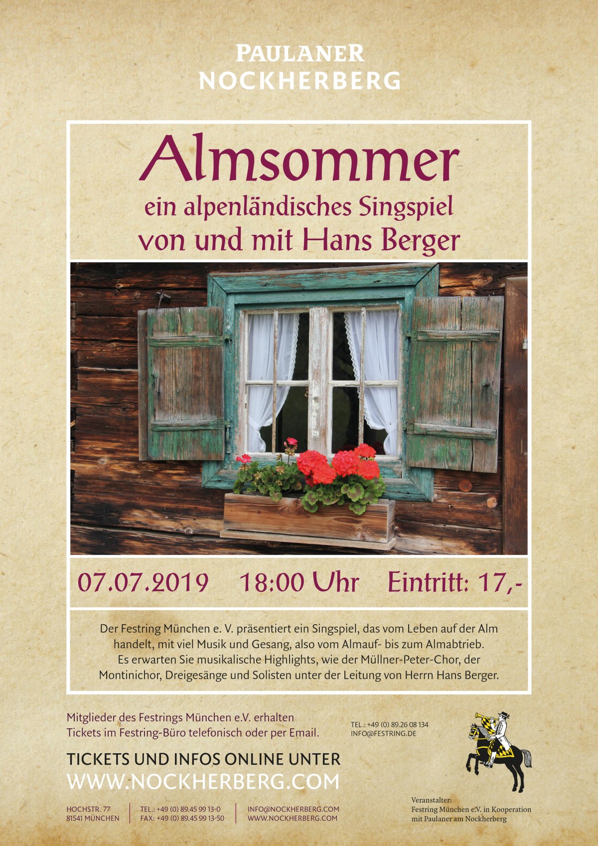 Der Festring München bietet am 7. Juli beim Paulaner am Nockherberg ein alpenländisches Singspiel von und mit Hans Berger. Der Abend bietet viel Musik und Gesang vom Almauf- bis zum Almabtrieb. Mitwirkende sind der Müllner-Peter-Chor, der Montini-Chor, Dreigesänge und Solisten unter der Leitung von Hans Berger. Karten gibt es unter www.nockherberg.com, Näheres auch telefonisch beim Festring München, Tel. 089-2608134.