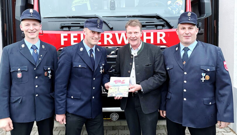 Dieser lobte die Ausarbeitung, die grafisch von der Greimhartingerin Susanne Krapf sowie inhaltlich von Schriftführer Stefan Arnold erstellt wurde. Die 60 Seiten umfassende Festschrift wird während der Festtage des Festzelts der Freiwilligen Feuerwehr (vom 06. bis 16.06. in Greimharting) im Festbüro käuflich zu erwerben sein, der Unkostenbeitrag liegt bei 5 Euro. Neben vielen Unterstützern für historische Bild- und Textquellen wurden auch eigens Aufnahmen mit einem professionellen Fotografen gemacht, um die Feuerwehr in bestem Licht darzustellen. Im Hintergrund der Übergabe ist auch das neue Einsatzfahrzeug zu sehen, welches am Festsonntag im Rahmen des Festgottesdiensts feierlich eingeweiht und offiziell in den Dienst gestellt wird. Weitere Informationen zum Fest sind auf der eigenen Internetseite www.greimhartinger-festwochen.de zu finden. So können hierüber nun auch Tischreservierungen für die Feuerwehrveranstaltungen getätigt werden.