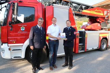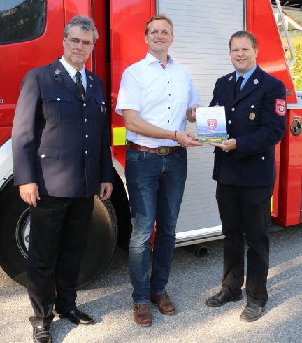 Bericht und Fotos: Heinrich Rehberg – Die beiden Vorsitzenden der Feuerwehr Aschau Werner Grill (rechts) und Christian Deml (links) übergaben vor dem Aschauer Feuerwehrhaus das erste Exemplar der druckfrischen Festschrift zum 150. Gründungsjubiläum der Aschauer Feuerwehr an Bürgermeister Simon Frank.