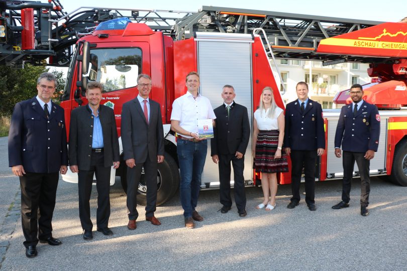 Die beiden Vorsitzenden der Feuerwehr Aschau Werner Grill und Christian Deml übergaben vor dem Aschauer Feuerwehrhaus das erste Exemplar der druckfrischen Festschrift zum 150. Gründungsjubiläum der Aschauer Feuerwehr an Bürgermeister Simon Frank. Bei der Präsentation waren auch Rainer Küblbeck vom Aschauer Gewerbeverein, sowie die Vertreter der drei Aschauer Banken Regina Müller, Georg Furtner und Jakob Stocker mit dabei. Alle vier hatten die Herausgabe des 160 Seiten starken Buches zum Jubiläum mit jeweils 1000 Euro gefördert. Das Gründungsfest war vom 14. bis zum 18. Mai vorgesehen, fiel aber Corona zum Opfer. Im Zuge dieses Festes sollten auch die beiden neuesten Fahrzeuge der Aschauer Feuerwehr, die große Drehleiter DLK 23/12 und das Tanklöschfahrzeug TLF 3000 den kirchlichen Segen erhalten; das wird nun zu einem späteren Zeitpunkt nachgeholt, versprachen Bürgermeister Simon Frank und die beiden Vorsitzenden der Feuerwehr.