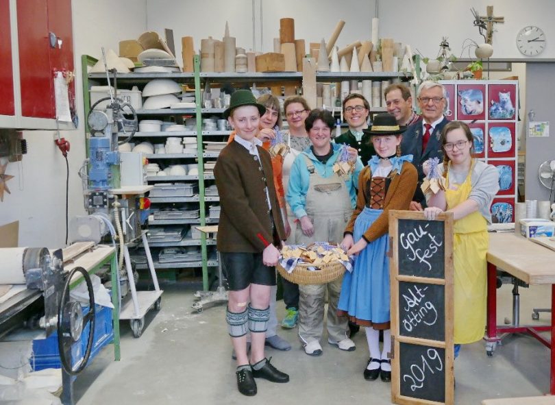 Foto: EnergieGenossenschaft Inn-Salzach eG – Übergabe der Festzeichen. Im Hintergrund Bildmitte: Pascal Lang (Vorstandsvorsitzender der EGIS eG), rechts daneben Ludwig Haunolder (Leiter der Werkstatt) und Elmar Wibmer (Vorstand der EGIS eG) umrundet von Mitarbeiterinnen der Keramikwerkstatt sowie der Trachtenjugend, Stefanie Hager und Tobias Niedermeier.
